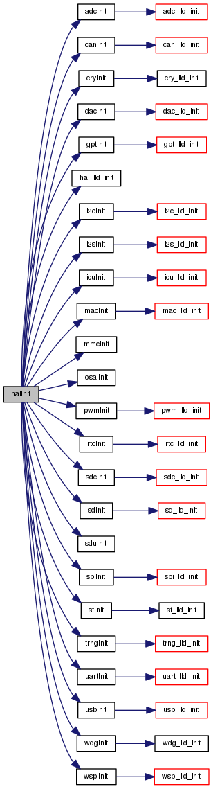 References adcInit(), canInit(), cryInit(), dacInit(), gptInit(), hal_lld_init(), i2cInit(), i2sInit(), icuInit(), macInit(), mmcInit(), osalInit(), palInit, pwmInit(), rtcInit(), sdcInit(), sdInit(), sduInit(), spiInit(), stInit(), trngInit(), uartInit(), usbInit(), wdgInit(), and wspiInit().