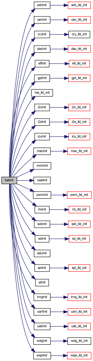 References adcInit(), canInit(), cryInit(), dacInit(), eflInit(), gptInit(), hal_lld_init(), i2cInit(), i2sInit(), icuInit(), macInit(), mmcInit(), osalInit(), palInit, pwmInit(), rtcInit(), sdcInit(), sdInit(), sduInit(), spiInit(), stInit(), trngInit(), uartInit(), usbInit(), wdgInit(), and wspiInit().