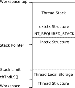 Note that the preemption area is only present when the thread is not running (switched out), the context switching is done by pushing the registers on the stack of the switched-out thread and popping the registers of the switched-in thread from its stack. The preemption area can be divided in up to three structures: